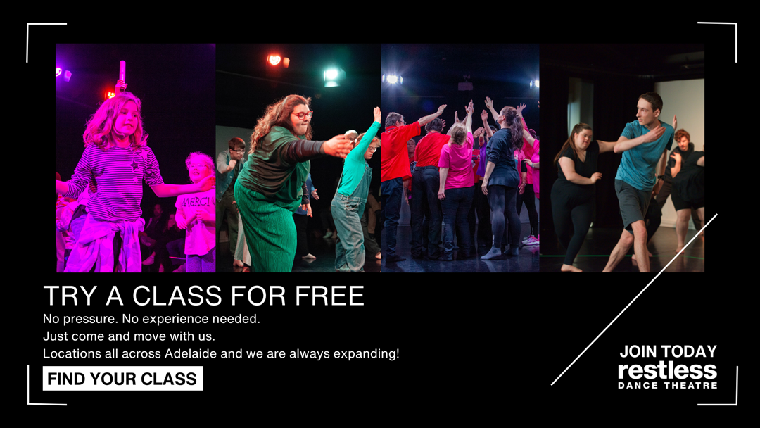 Restless Dance Theatre is Australia’s leading force in inclusive contemporary dance. On stage, on film and in unexpected spaces, we create bold, visually arresting dance theatre that challenges convention, shifts perspectives and redefines what virtuosity looks like. Through early engagement programs, rigorous training and professional pathways, we build meaningful, sustained careers for neurodivergent and disabled artists.