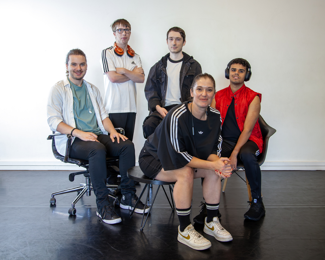 Image: Bhodi Hudson (Company Dancer), Jayden Couzner (Central Dancer and Emerging Artist), Ty Buhagiar (Emerging Artist), Emma Stokes (Dance Artist & Disability Inclusion Specialist) and Sidney Debba (Company Dancer).